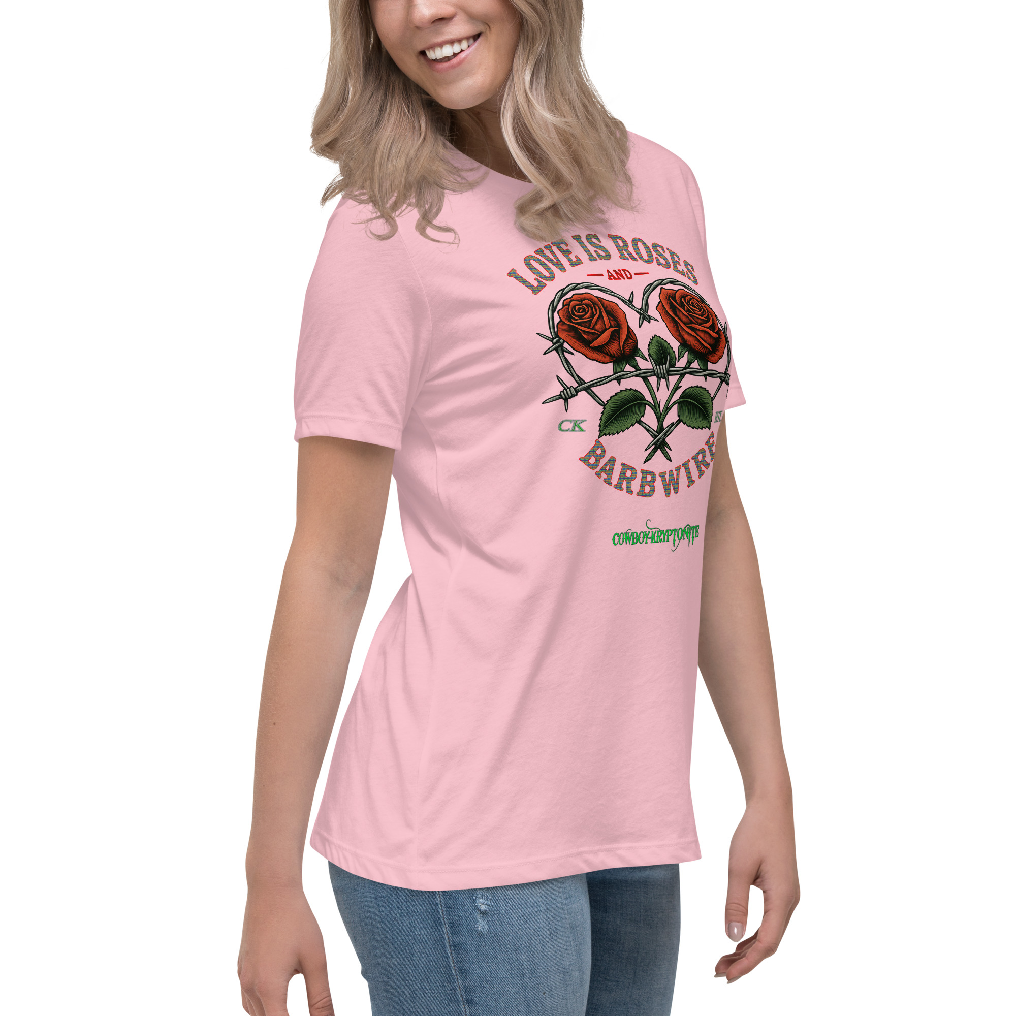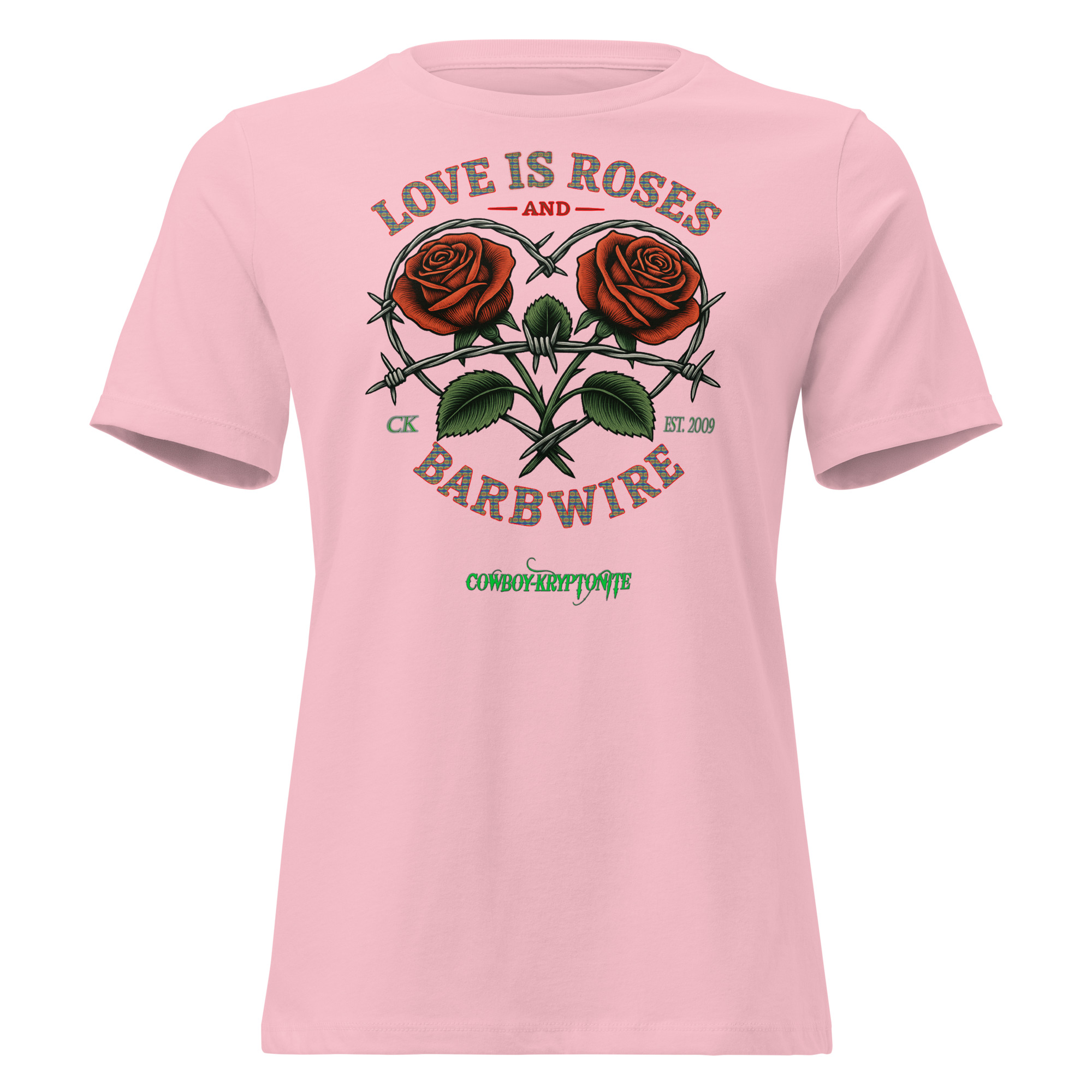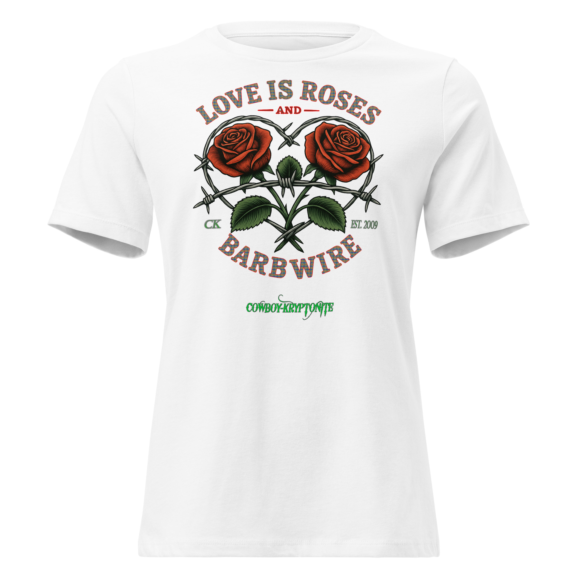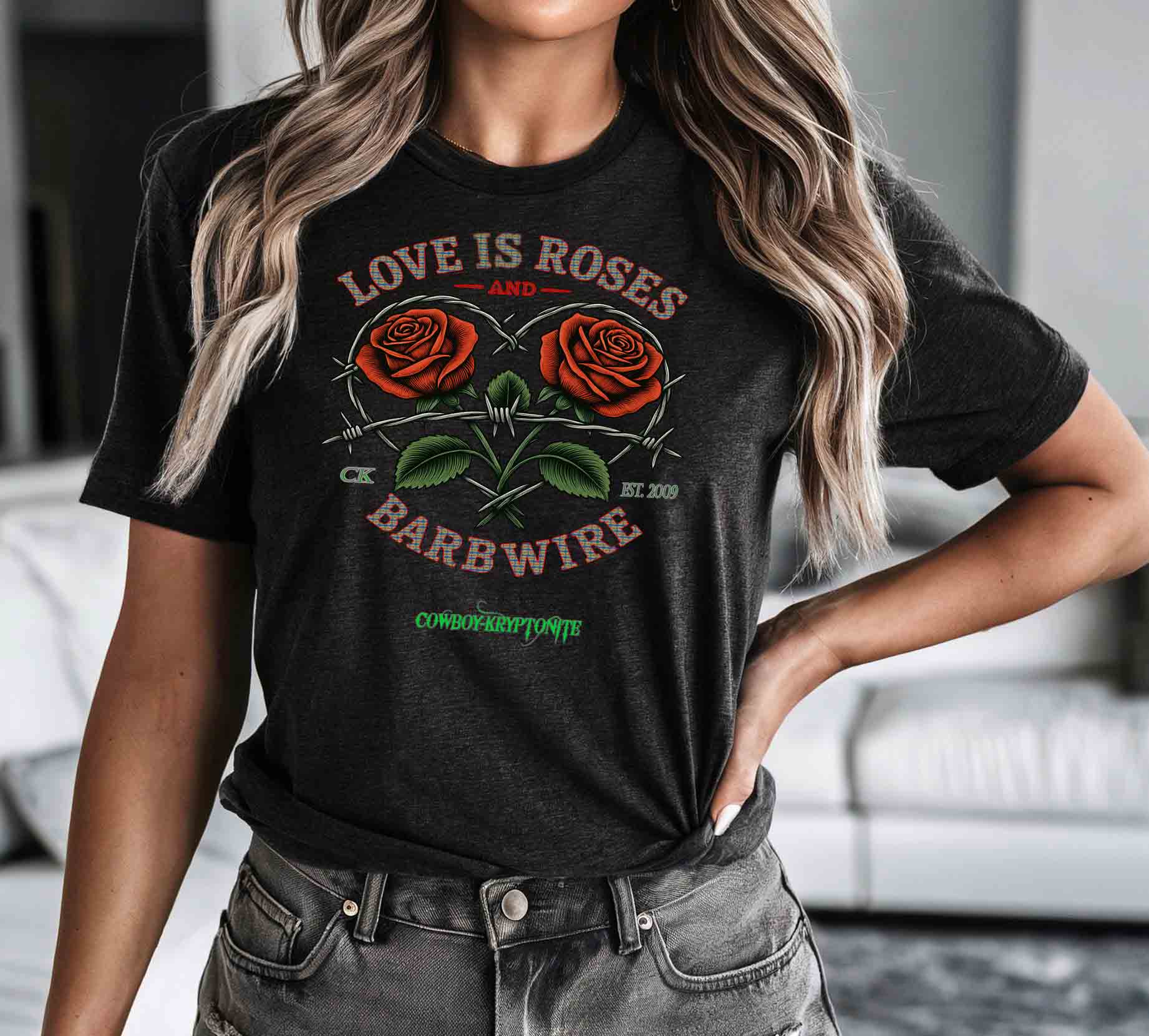 Featuring our Love Is Roses & Barbwire design — two bold roses wrapped in a heart of barbwire — this shirt is all about beauty, grit, and a little outlaw charm. Perfect for rodeos, bonfires, brunch dates, or breaking hearts on a Tuesday.