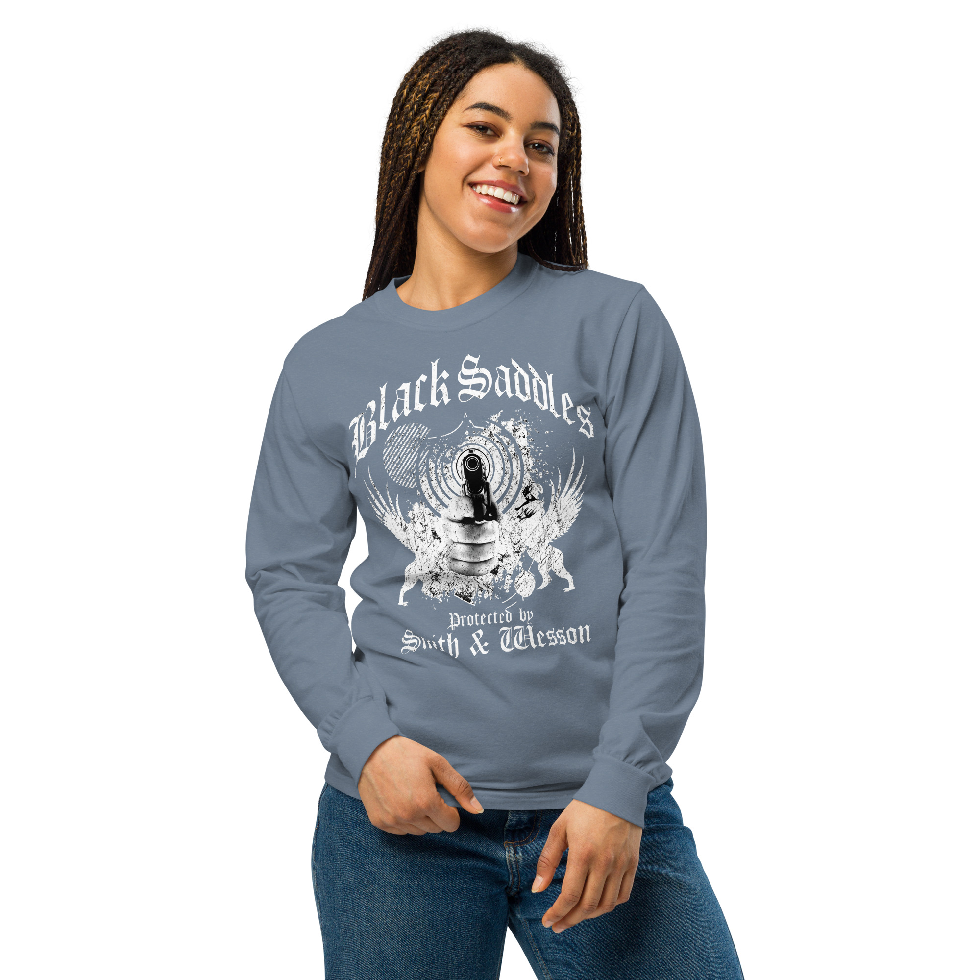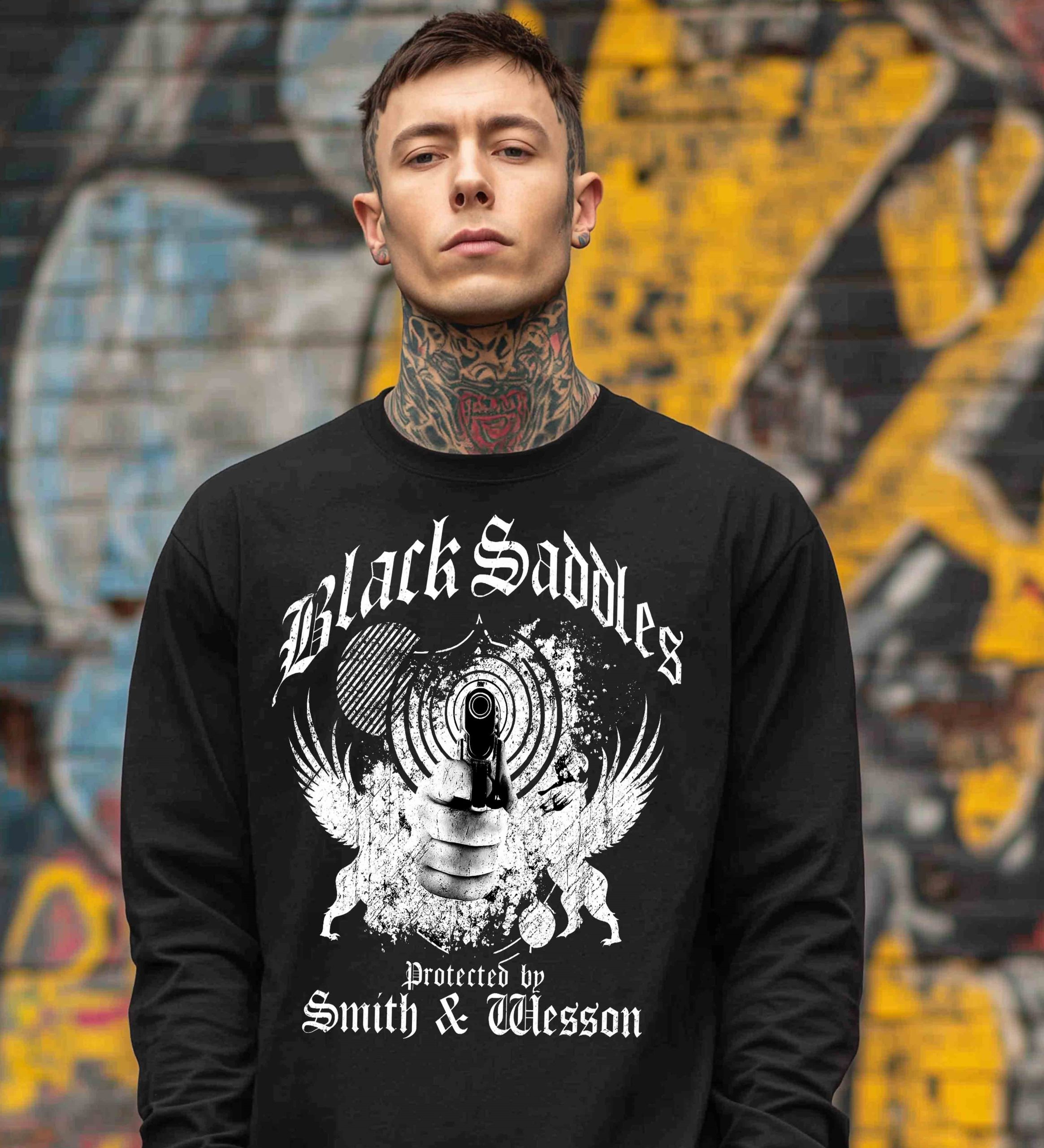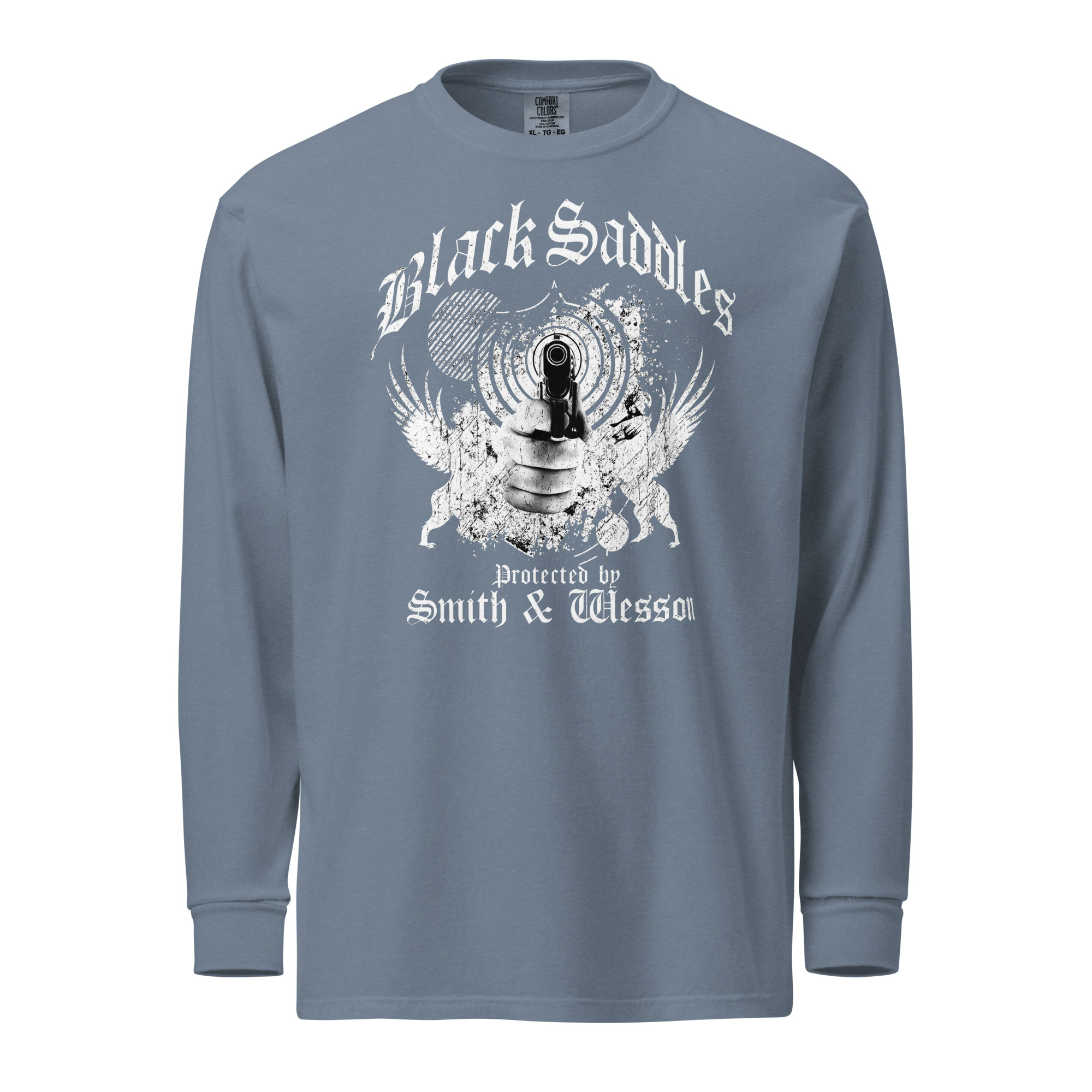 Relaxed, tough, and effortlessly comfortable, this shirt pairs perfectly with the bold Black Saddles “Protected by Smith & Wesson” design. Whether you’re spending the day on the road, at the range, or just taking it easy, this long sleeve is built for whatever the West throws your way.