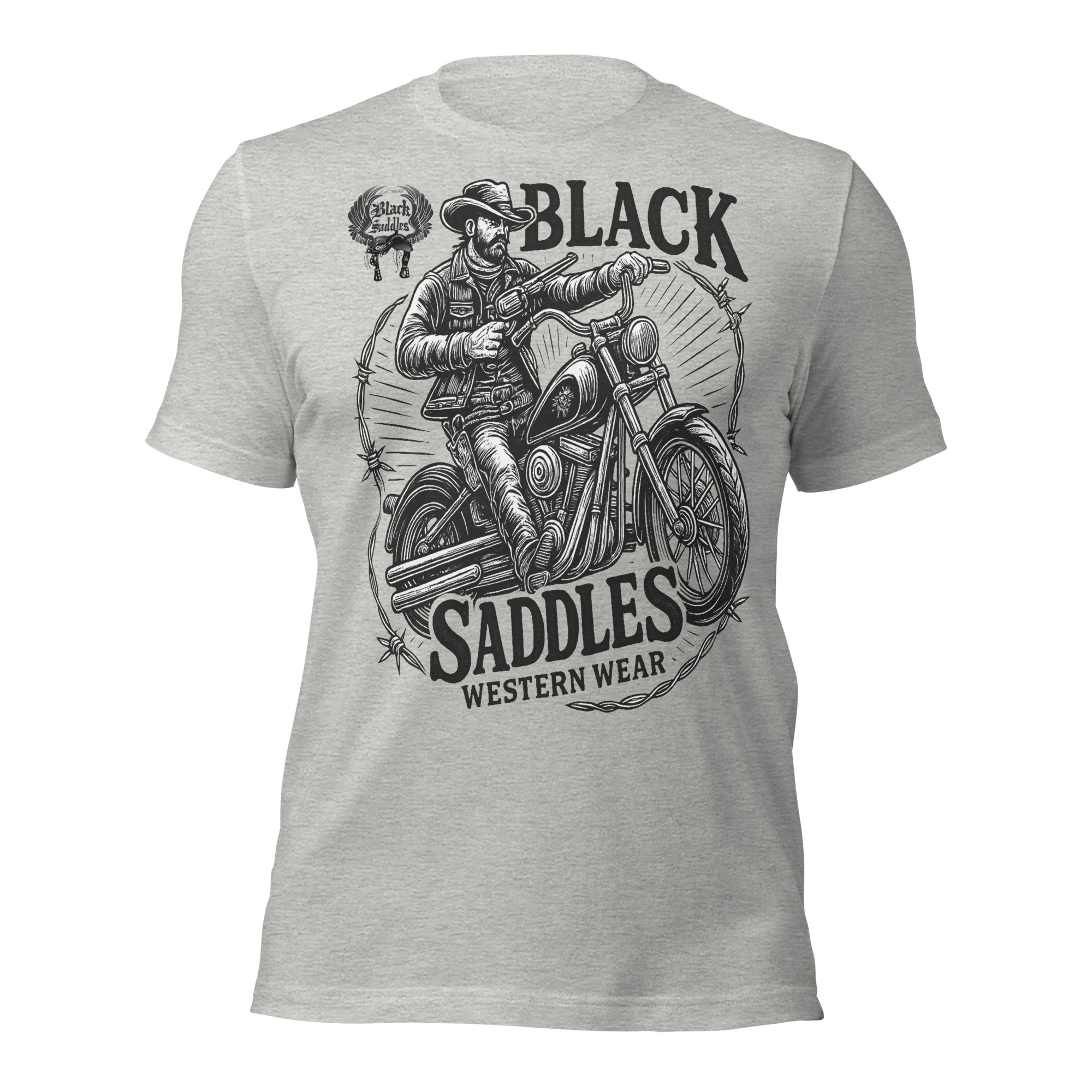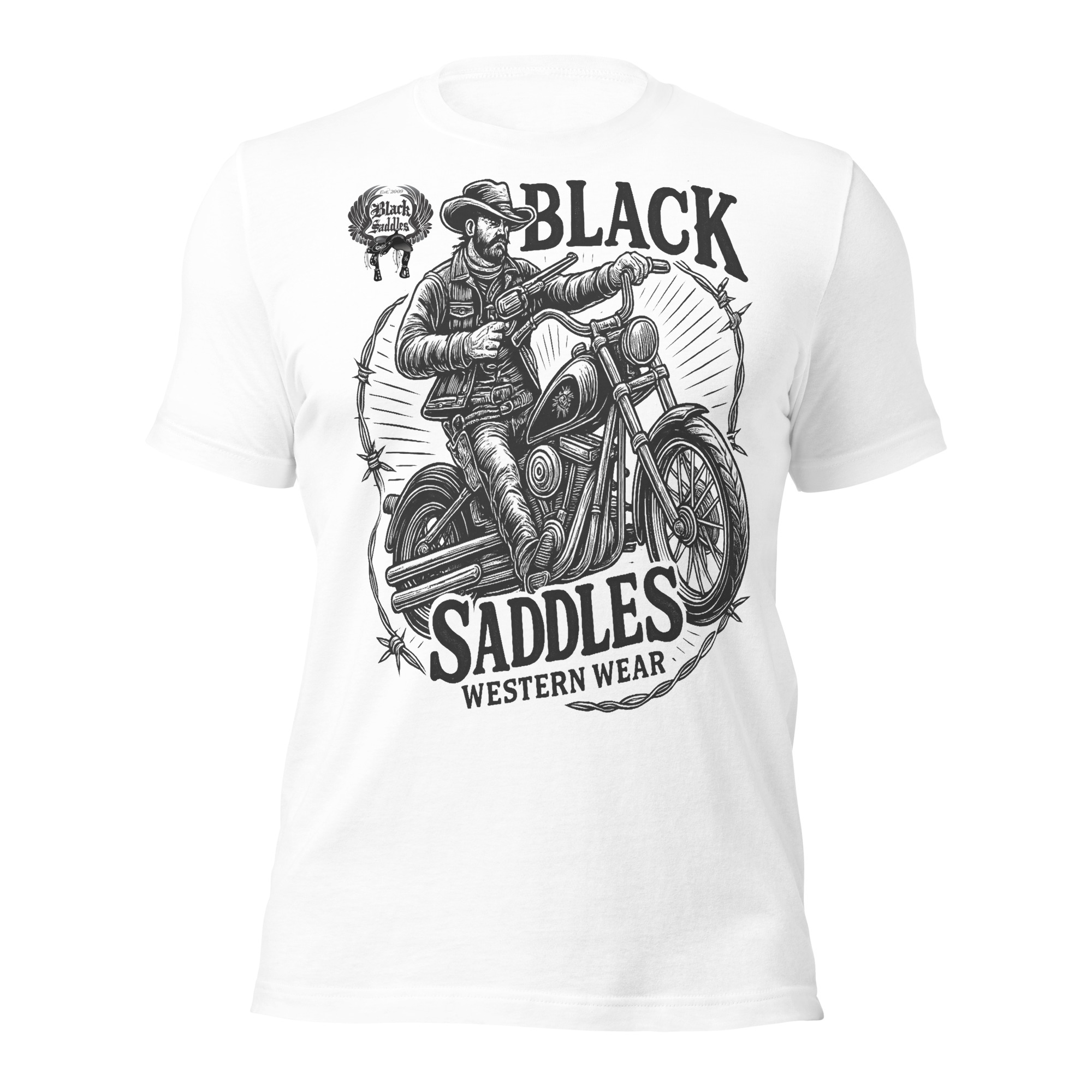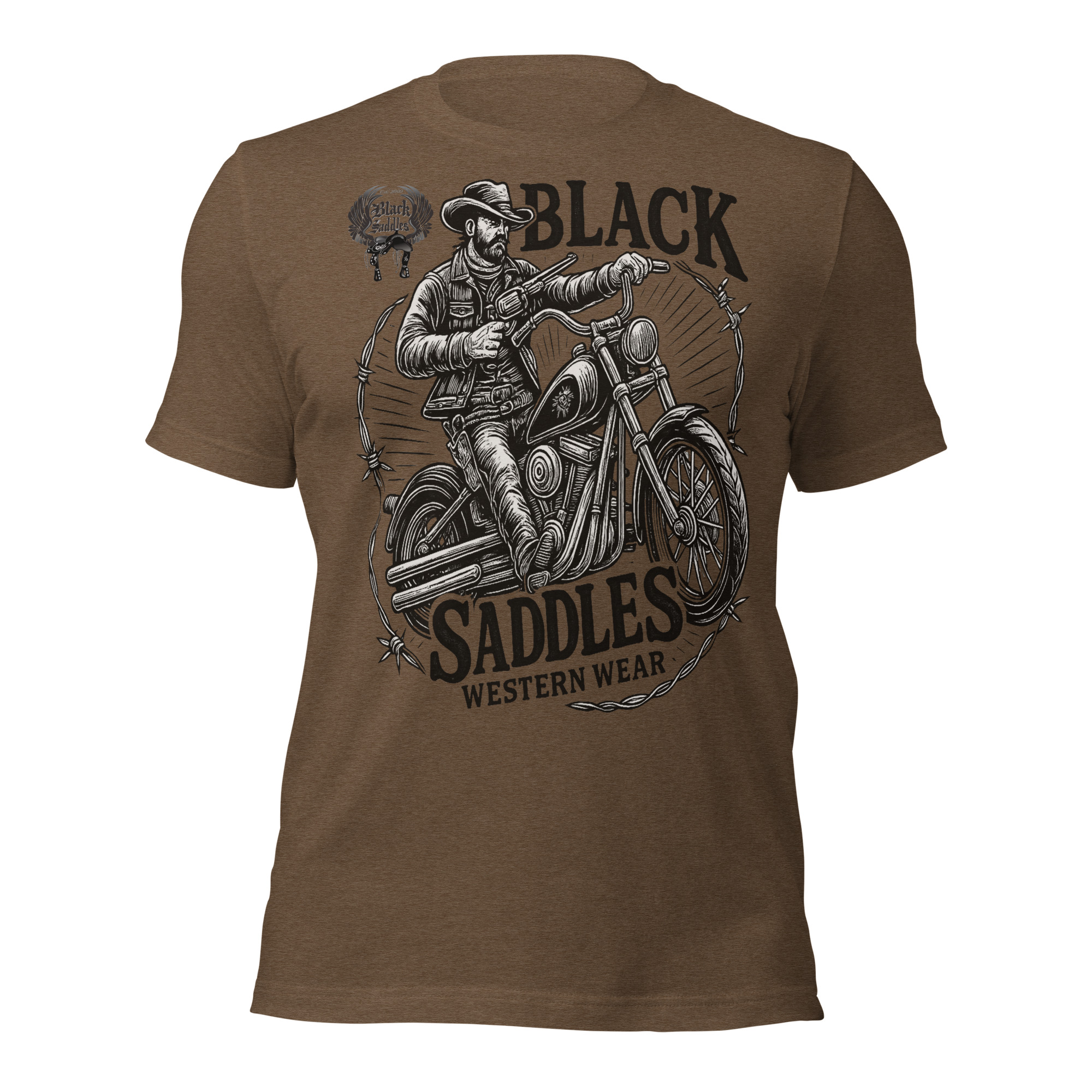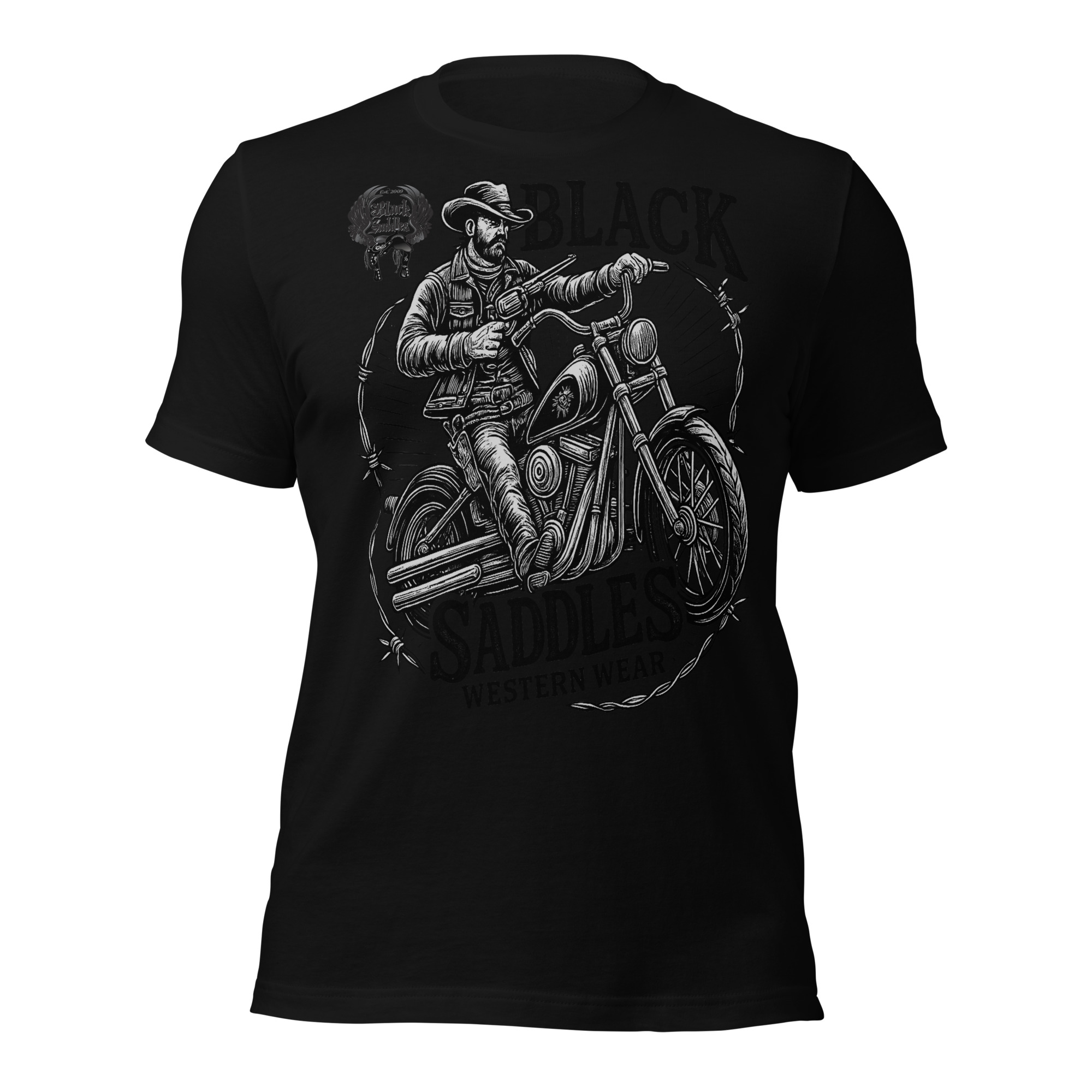 Where the open range meets the open road — the Black Saddles biker tee is built for the ones who live untamed. A fusion of motorcycle grit and western soul, this design celebrates the riders who trade ordinary for outlaw and sunsets for headlights.
