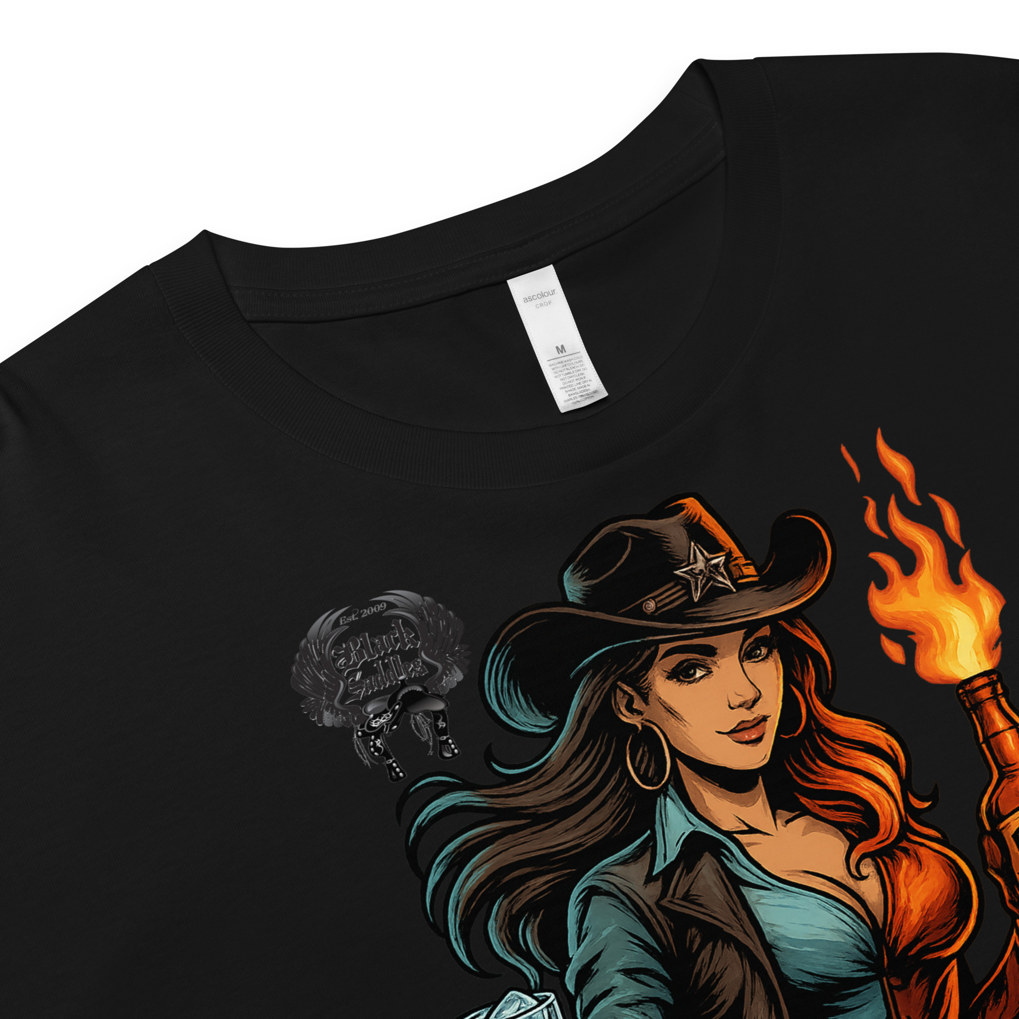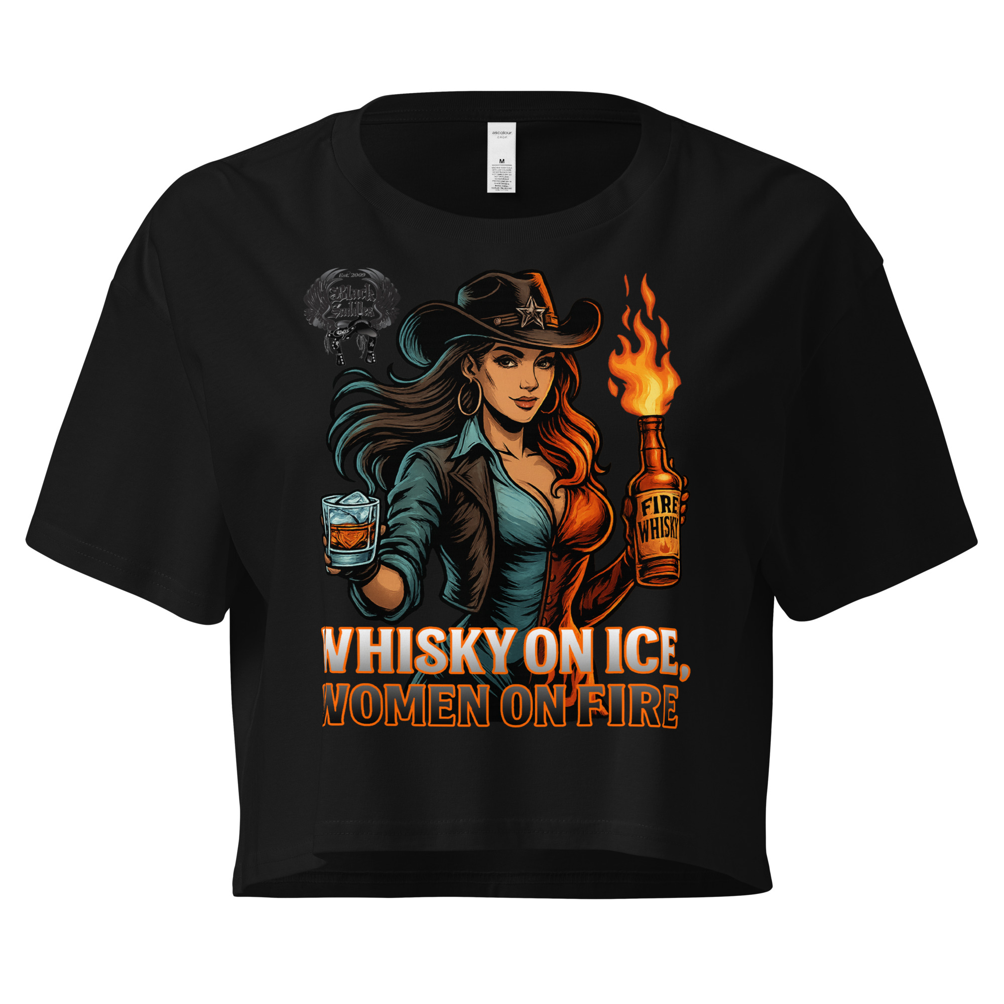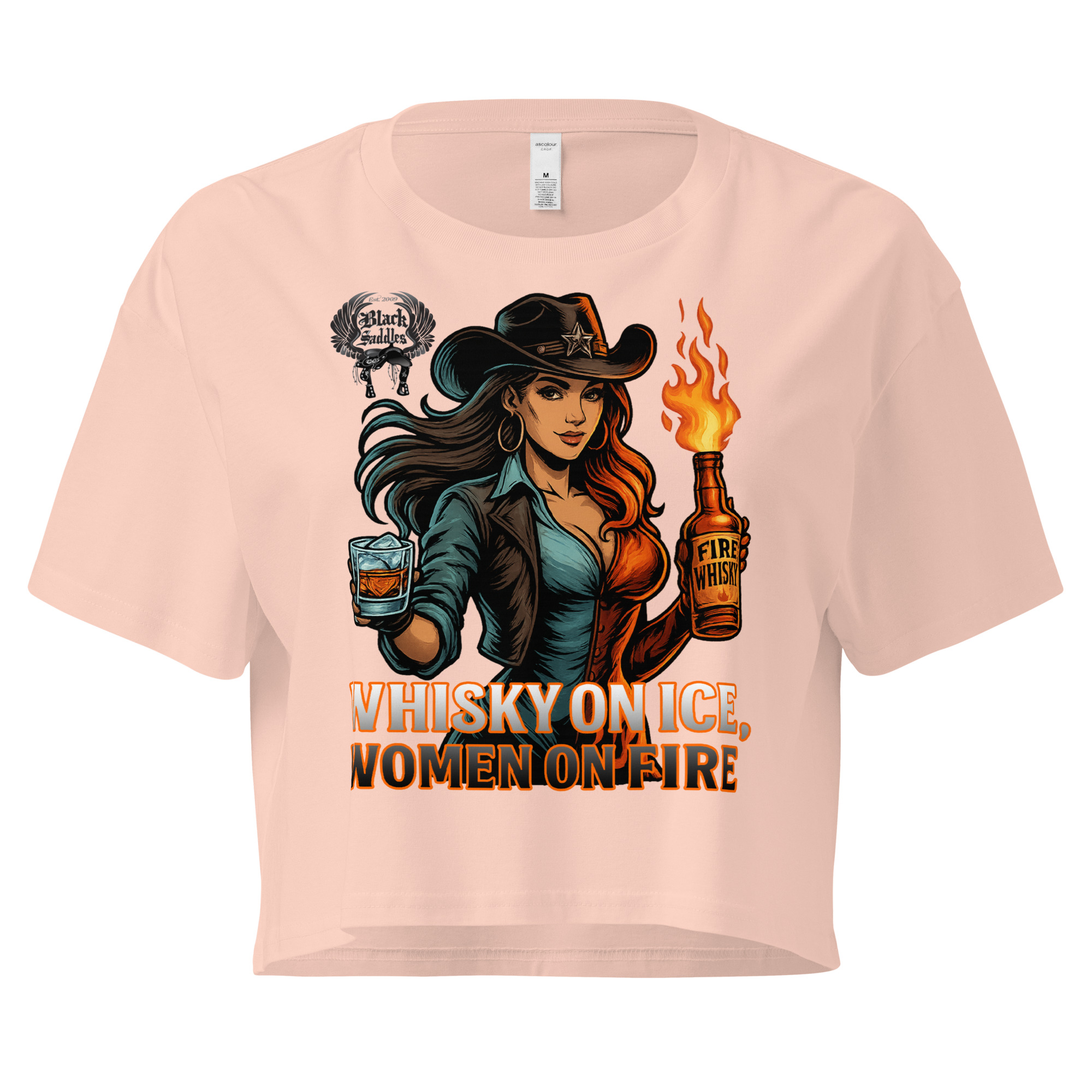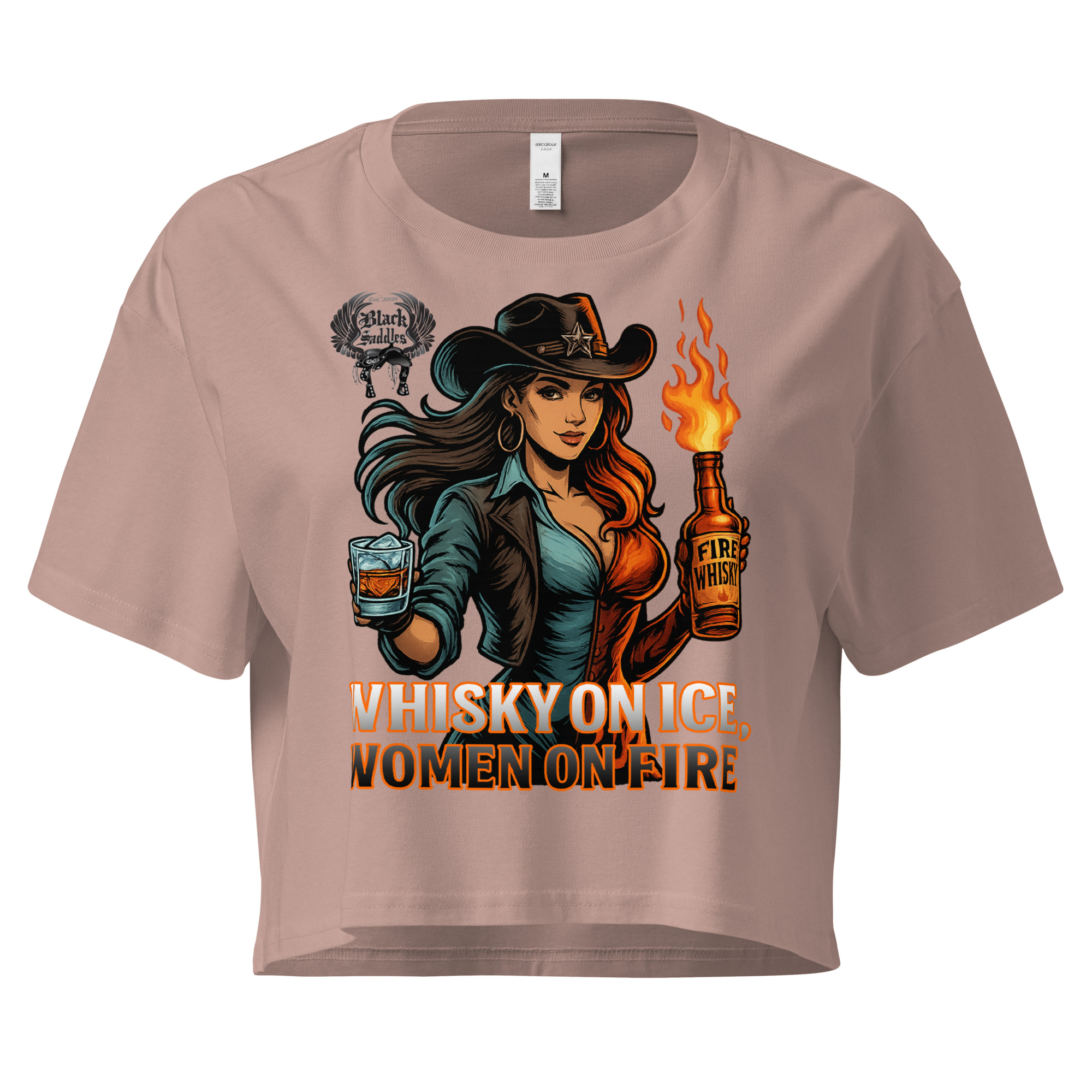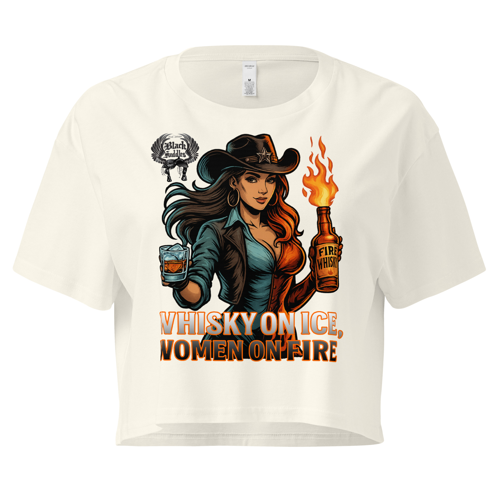 Bring the heat and own the moment with the official Black Saddles “Whisky on Ice, Women on Fire” Crop Tee.