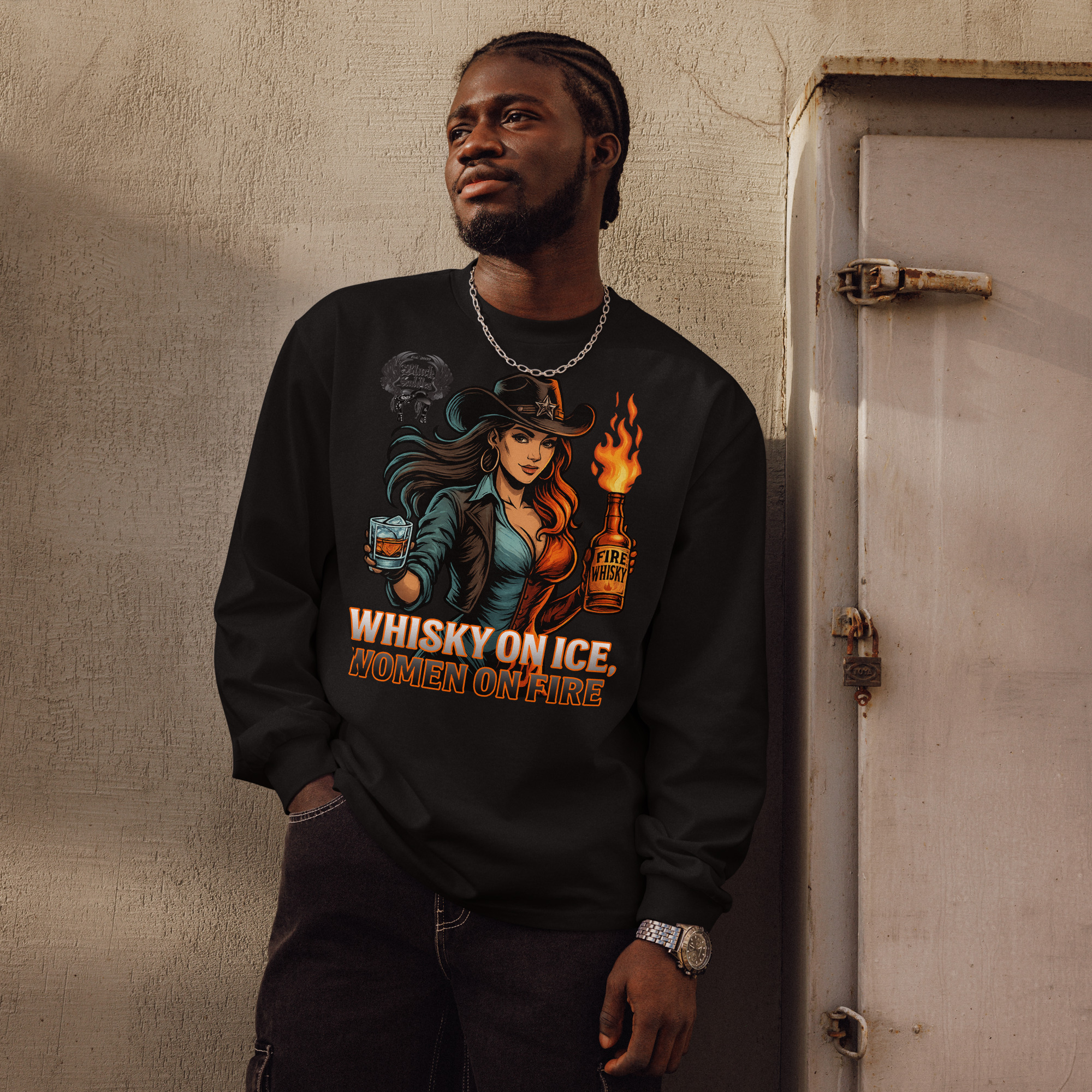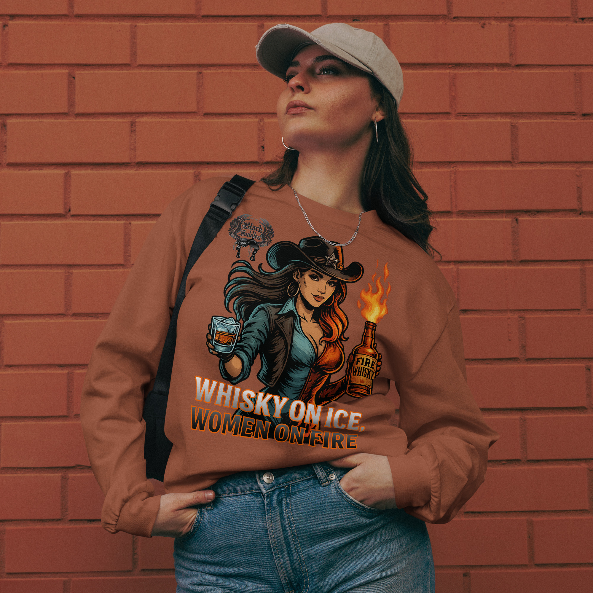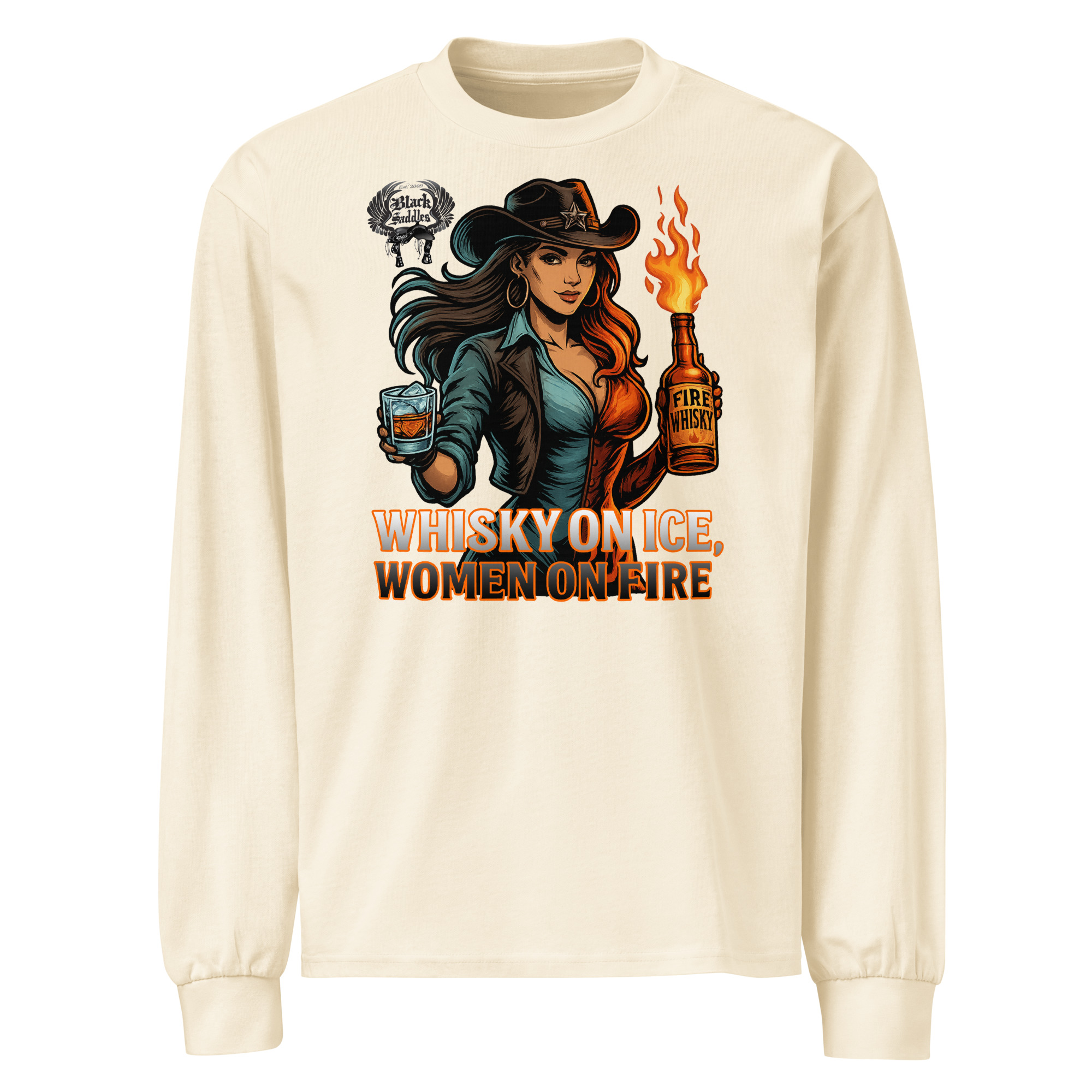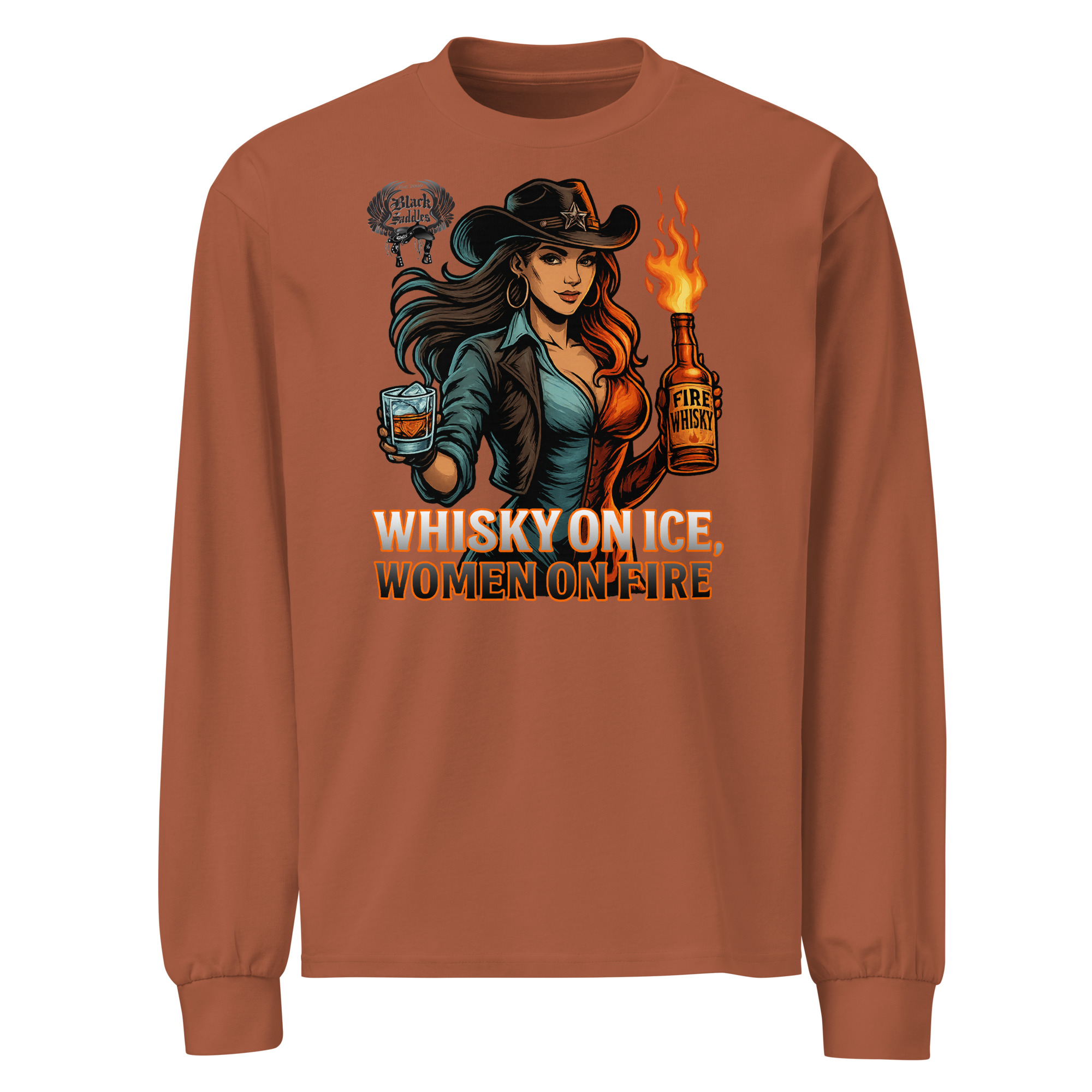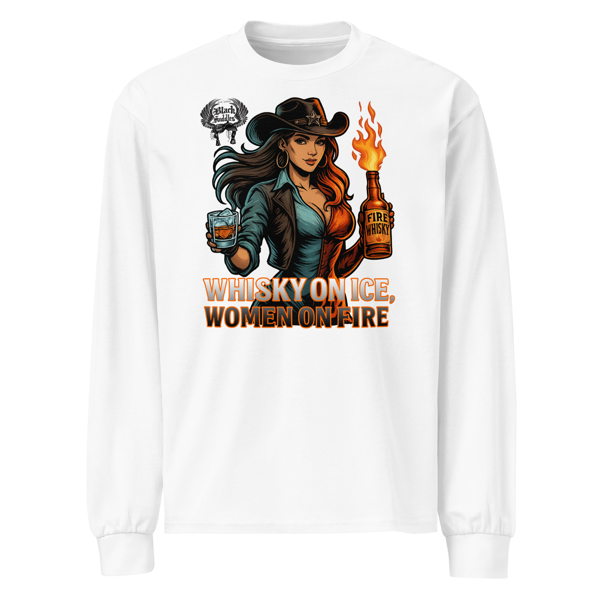 ? Keep the fire burning all year long with the Black Saddles “Whisky on Ice, Women on Fire” Long Sleeve Tee.