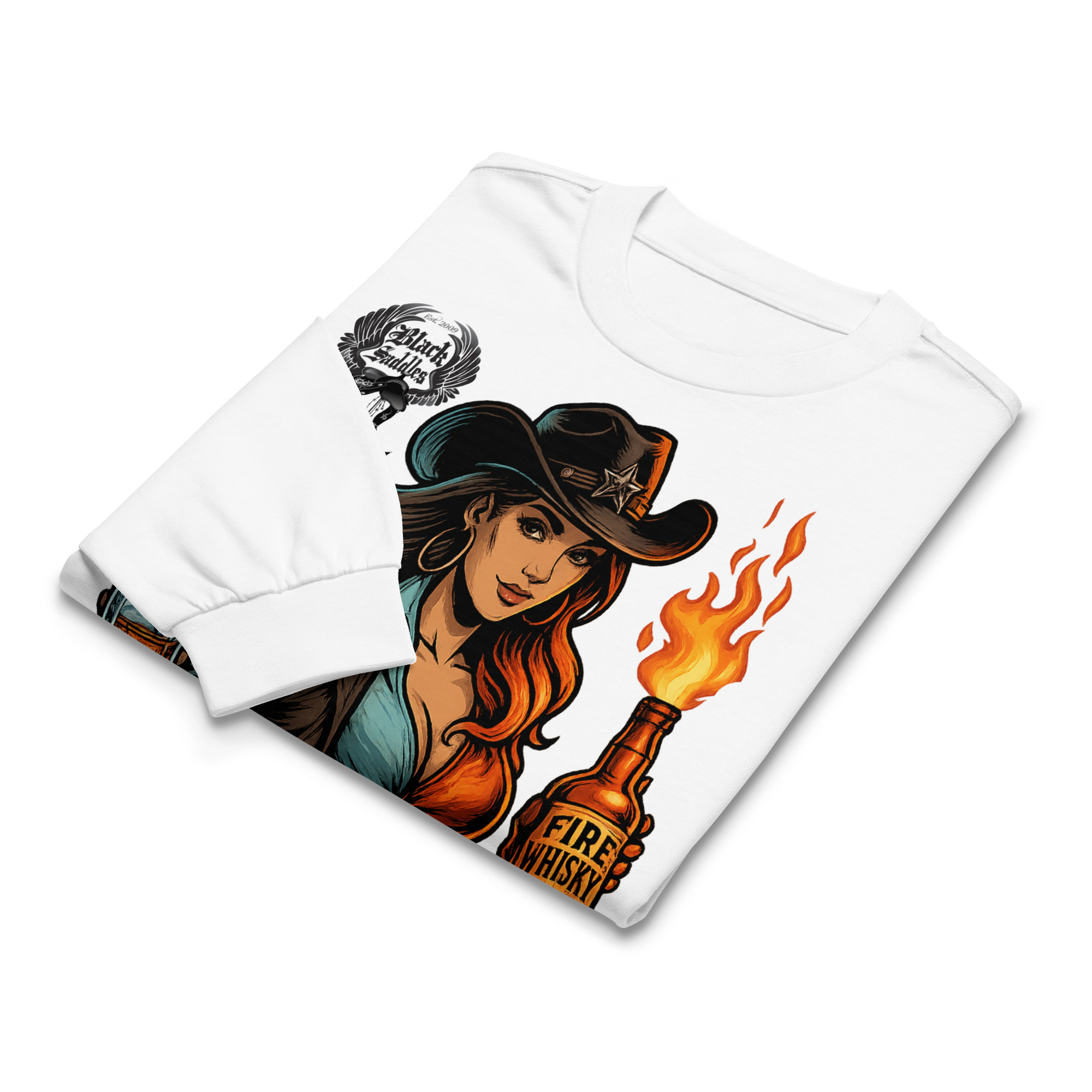 The iconic Black Saddles cowgirl artwork shines on this silhouette — fiery, confident, and impossible to ignore. Throw it on with jeans, boots, or a flannel, and you’ve got a look that hits every time.