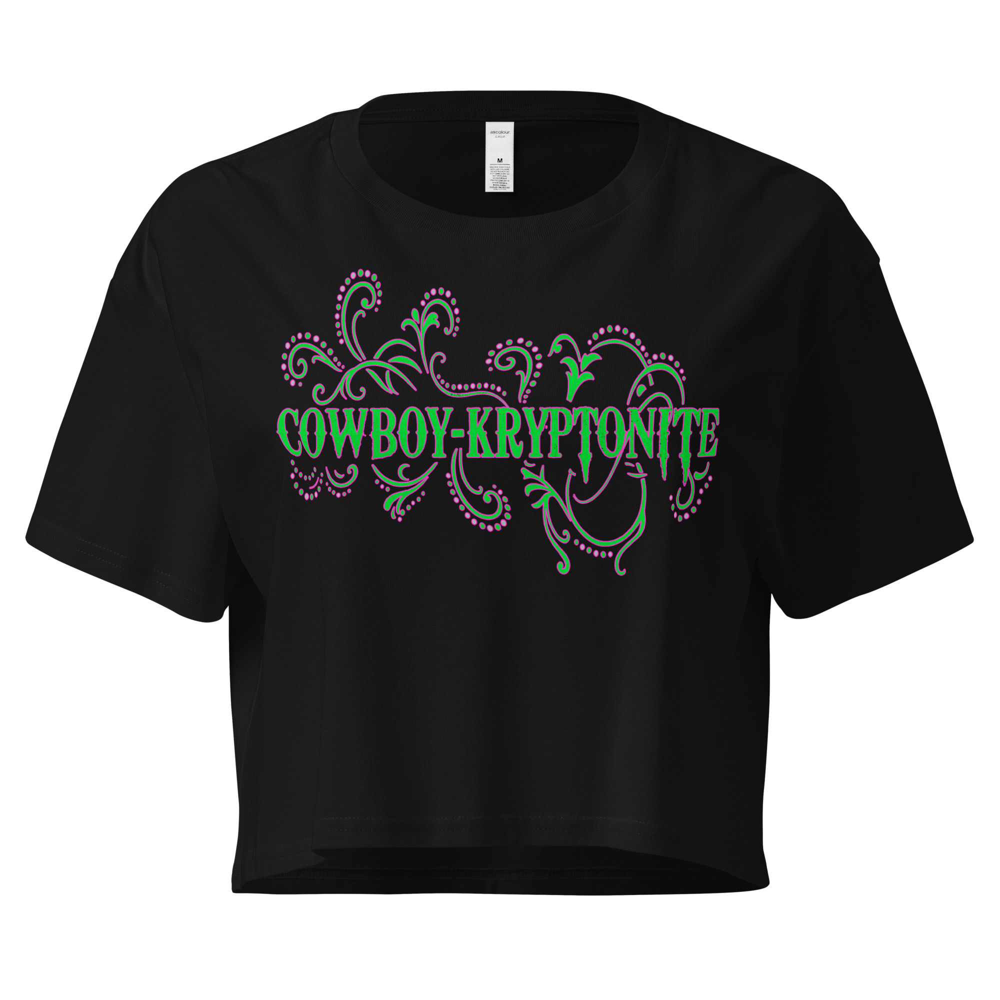 The Classic Cowboy Kryptonite Crop delivers bold western femininity with just the right amount of tease. Soft curves, a little midriff, and a logo that says: