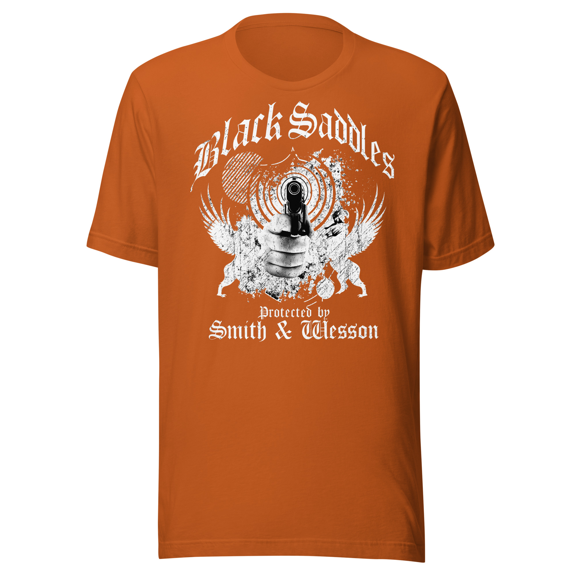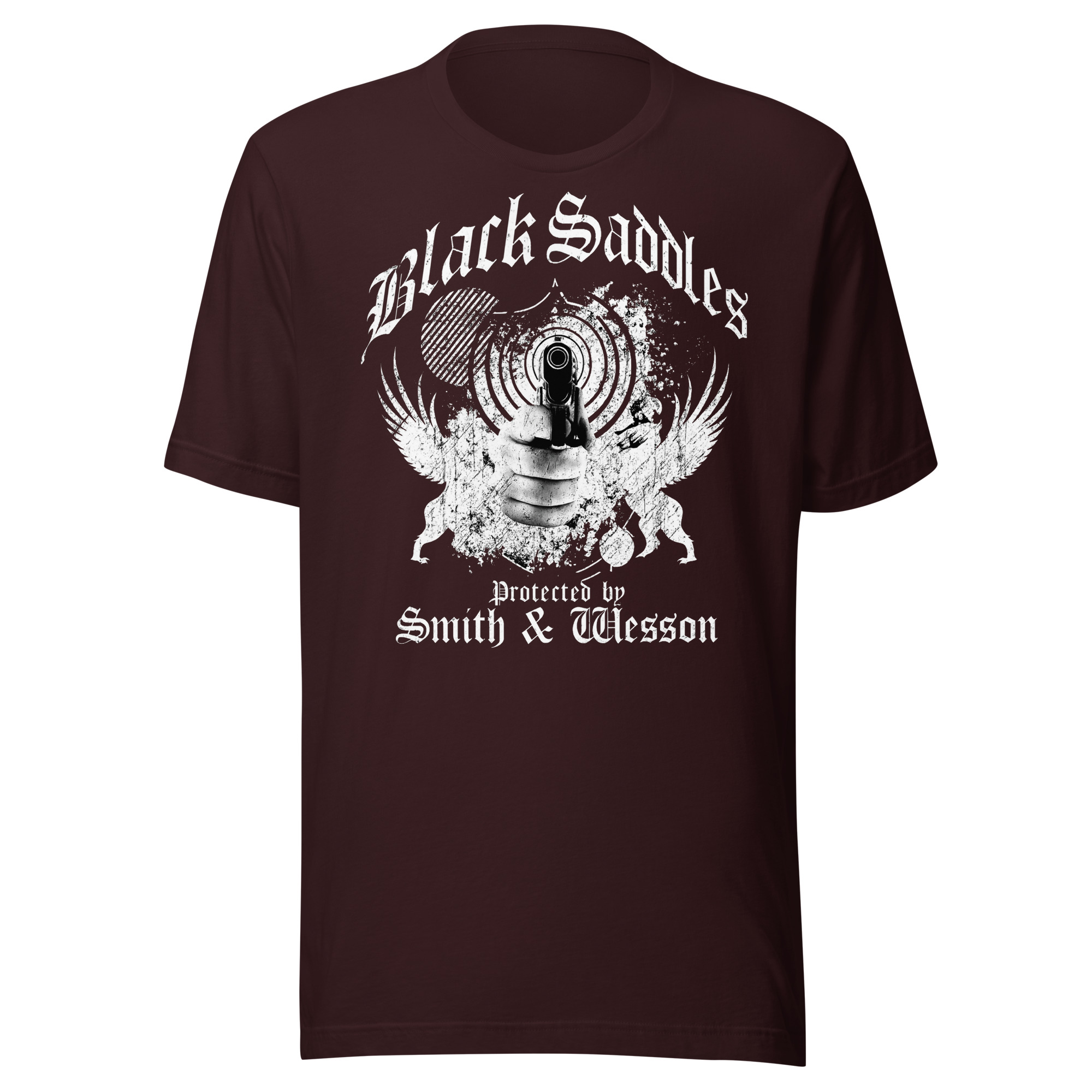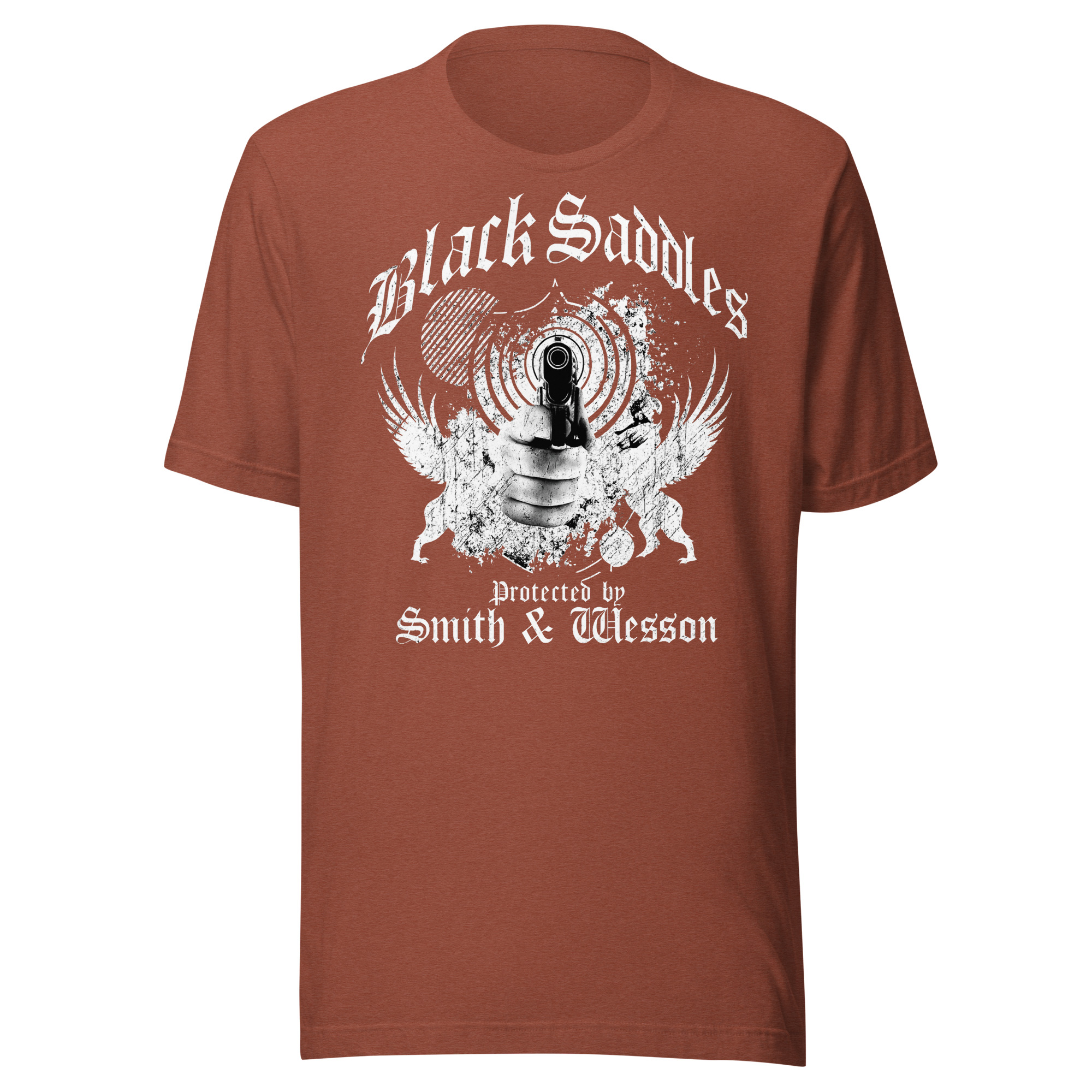 Freedom isn’t given — it’s defended. The Black Saddles Protected by Smith & Wesson tee is a loud-and-clear message that the American spirit stands ready. Featuring a front-and-center muzzle perspective with winged defenders and gritty distressed artwork, this design honors those who refuse to be victims.