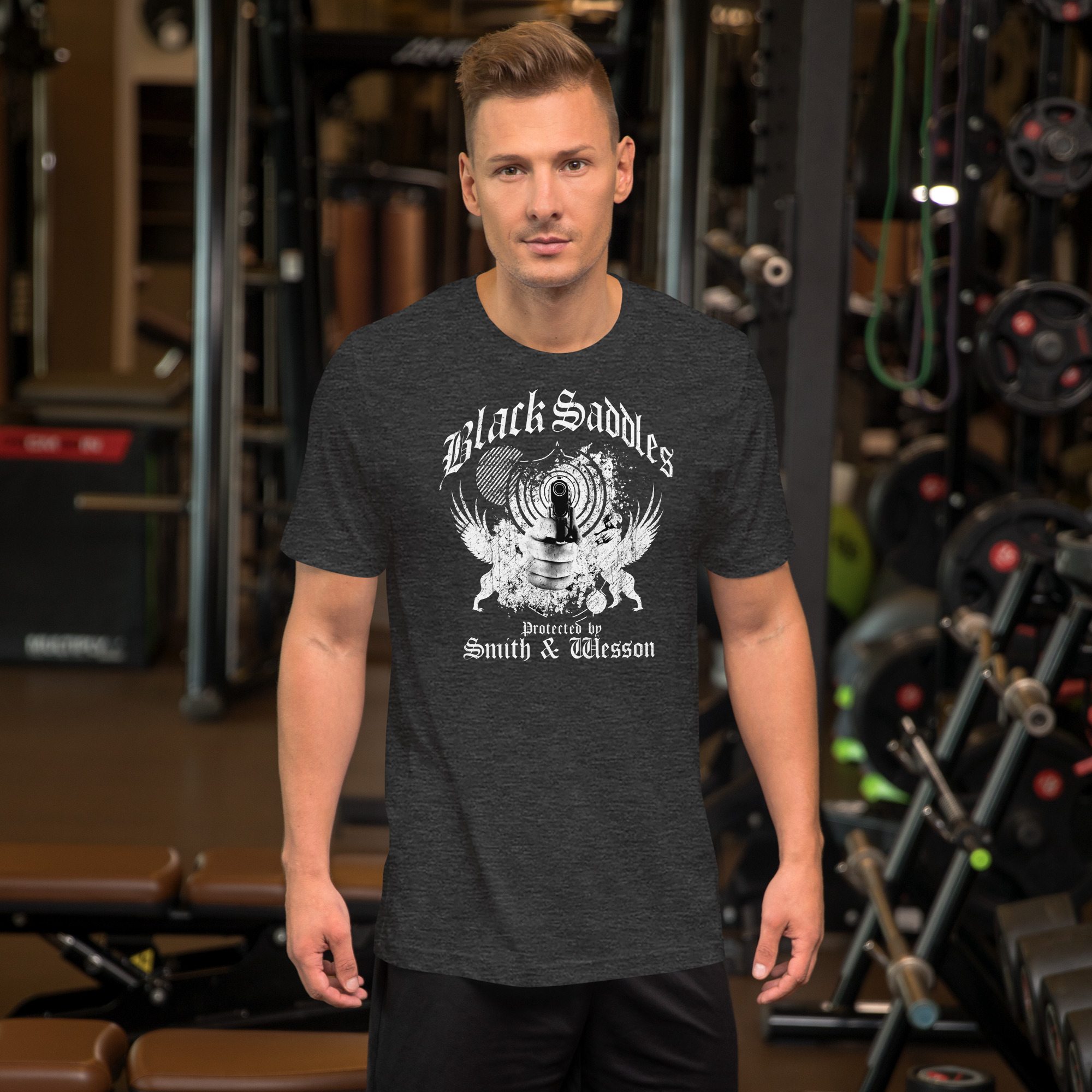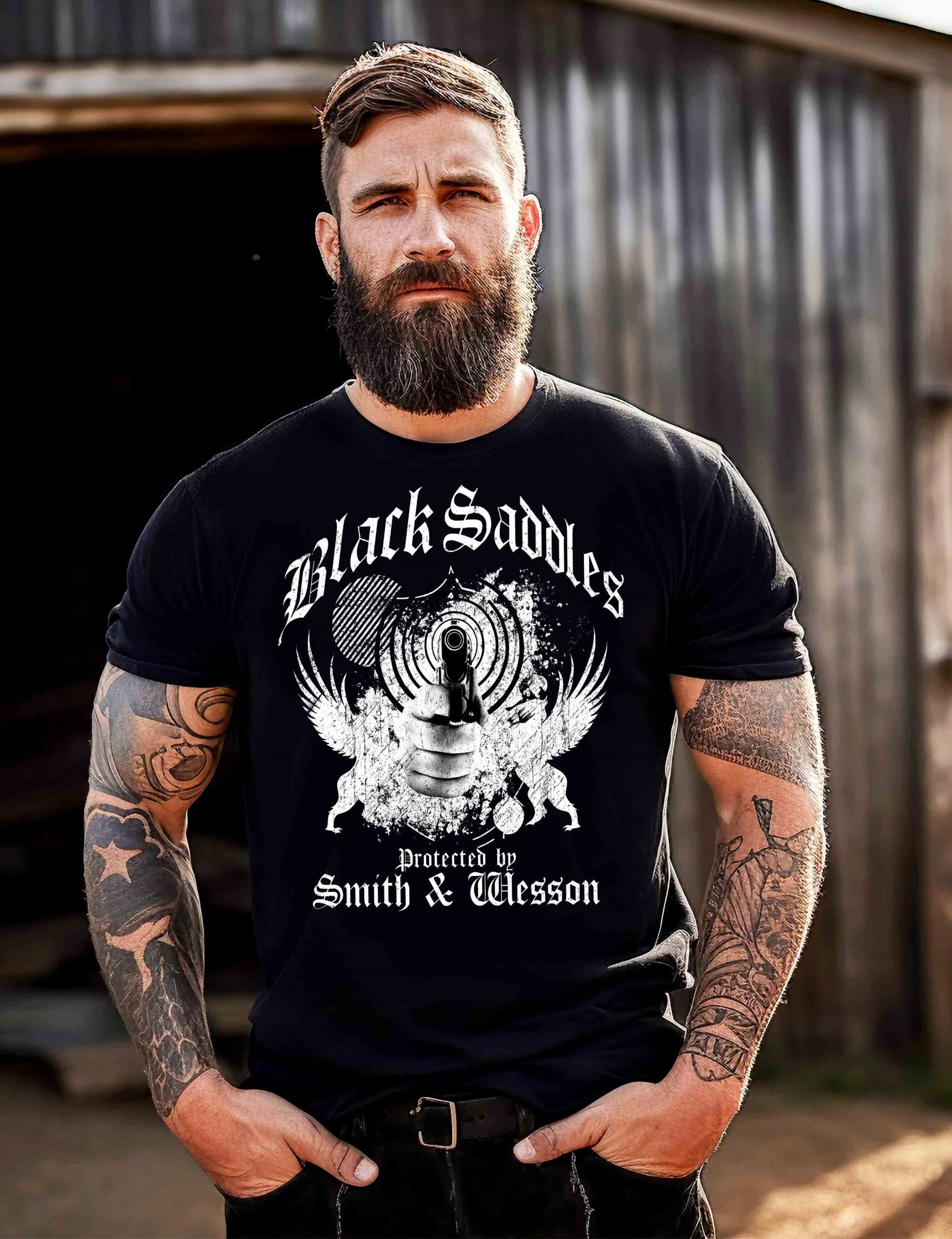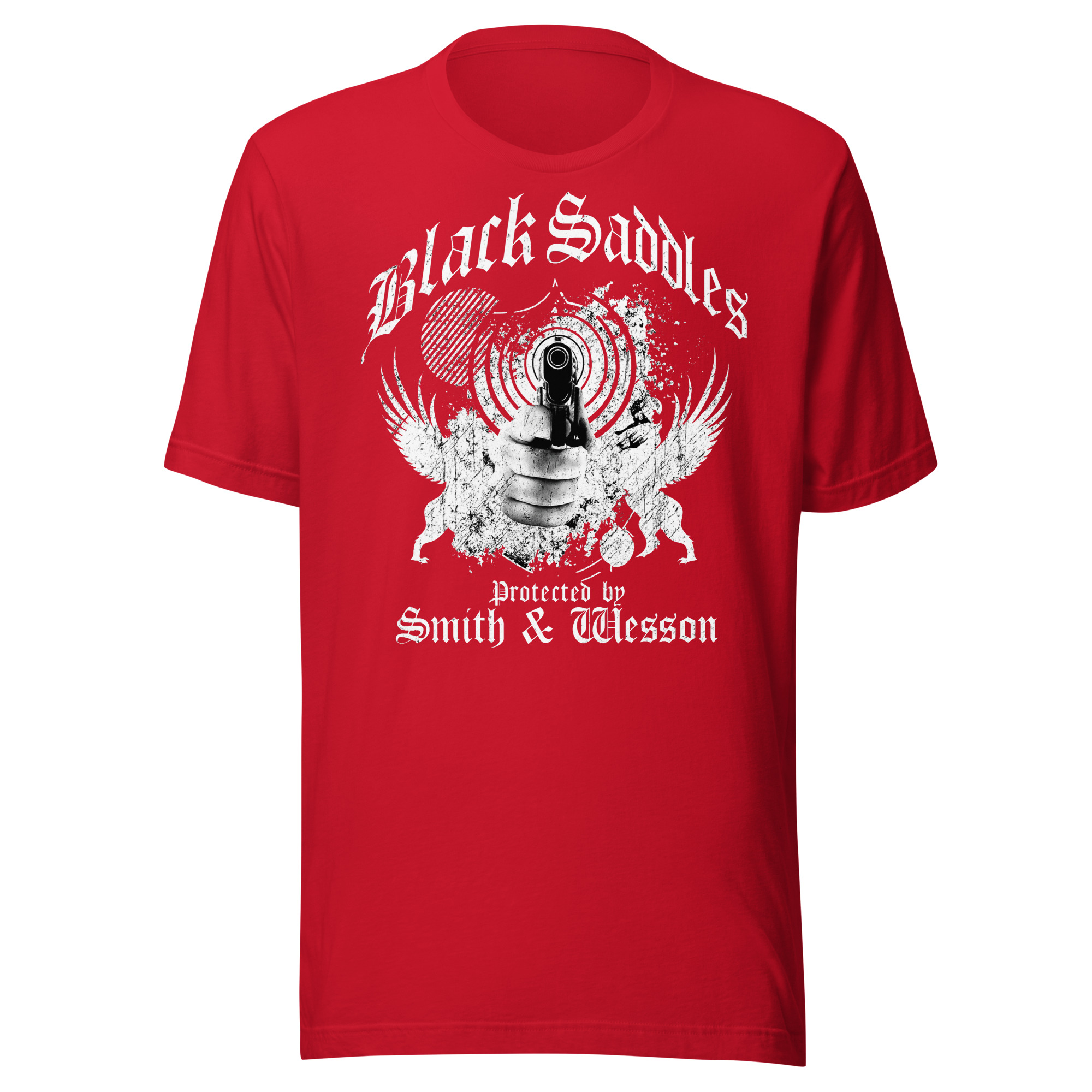 Freedom isn’t given — it’s defended. The Black Saddles Protected by Smith & Wesson tee is a loud-and-clear message that the American spirit stands ready. Featuring a front-and-center muzzle perspective with winged defenders and gritty distressed artwork, this design honors those who refuse to be victims.